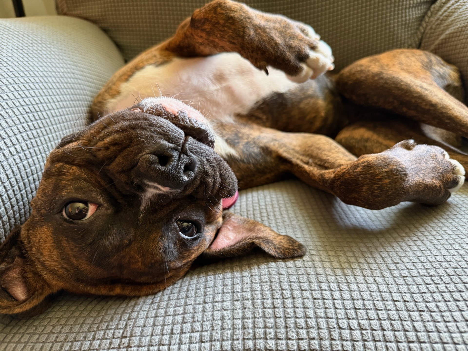 Zya is a bouncy boxer puppy who’s basically pure energy in a brindle package. This girl arrived and immediately decided our house is her personal racetrack. Zoomies all day? Check. Stealing shoes like it’s her job? Double check. Trying to bust out of the house on the regular by opening doors? Oh yeah. She’s a total lunatic with that classic boxer puppy “I have no off switch” mode. We’ve already lost count of how many times we’ve said “Zya NO!” followed by cleaning up whatever mess she has made.